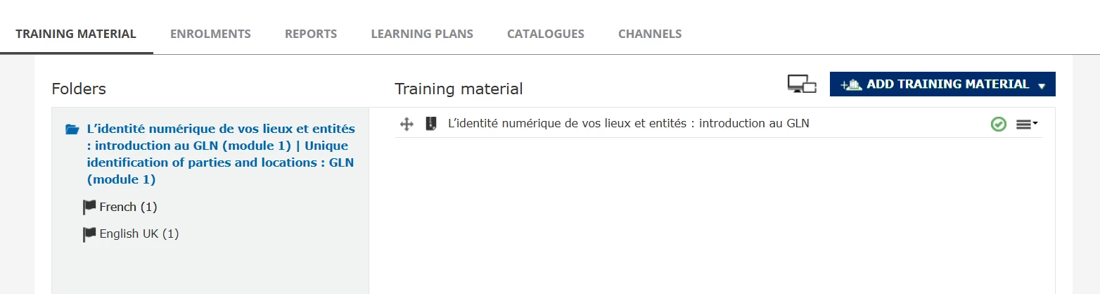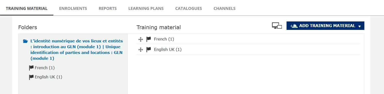 This second image I have clicked on the word French on the left, but there is no indication that I have done that (I mean other than I can see the training material is named in French). If there is no training material yet, I can not tell without having to click back and forth to confirm)