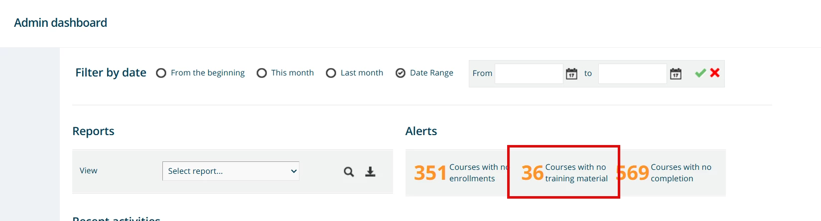 We are new customers about to go live and we are trying to take advantage of the build in admin dashboard that gives us a high-level overview of the platform and content performance. In the dashboard there is a statistic on number of courses without training materials, but I cannot figure out from course management, reports or insights on how to identify exactly which courses do not have any training materials. Is anyone aware of a report that gives this data or how to set on up?