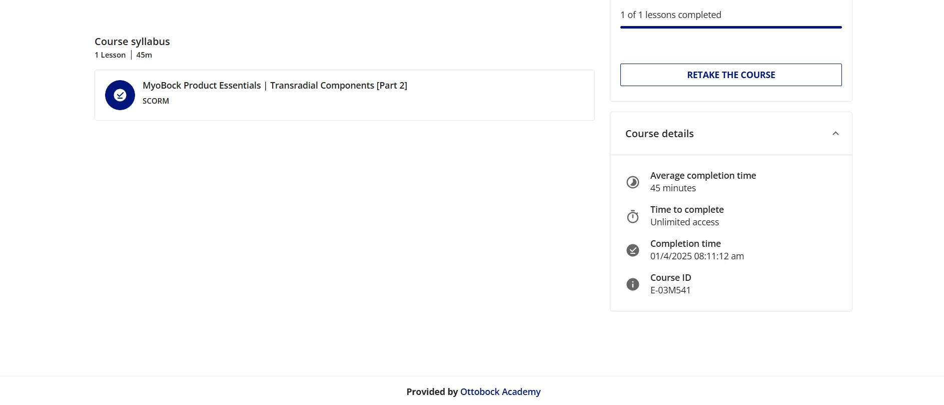 - Retake the course: this button seems nice but it resets the learner’s progress. There’s no real need for this button if the navigation is set to free and the user can go back anytime and look at the content again. I’d like to be able to hide this, but I can’t use CSS code to do it. My company won’t allow it.