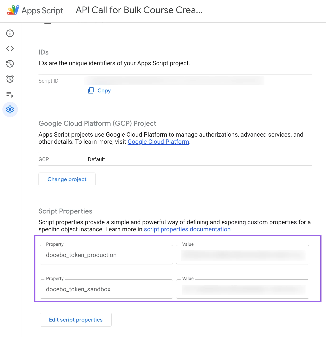 Under Project Settings → Script Properties, create two properties: