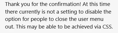 I’m trying to disable the option for users to close the User Menu in my application. Does anyone know if there are built-in codes or configurations available to achieve this?