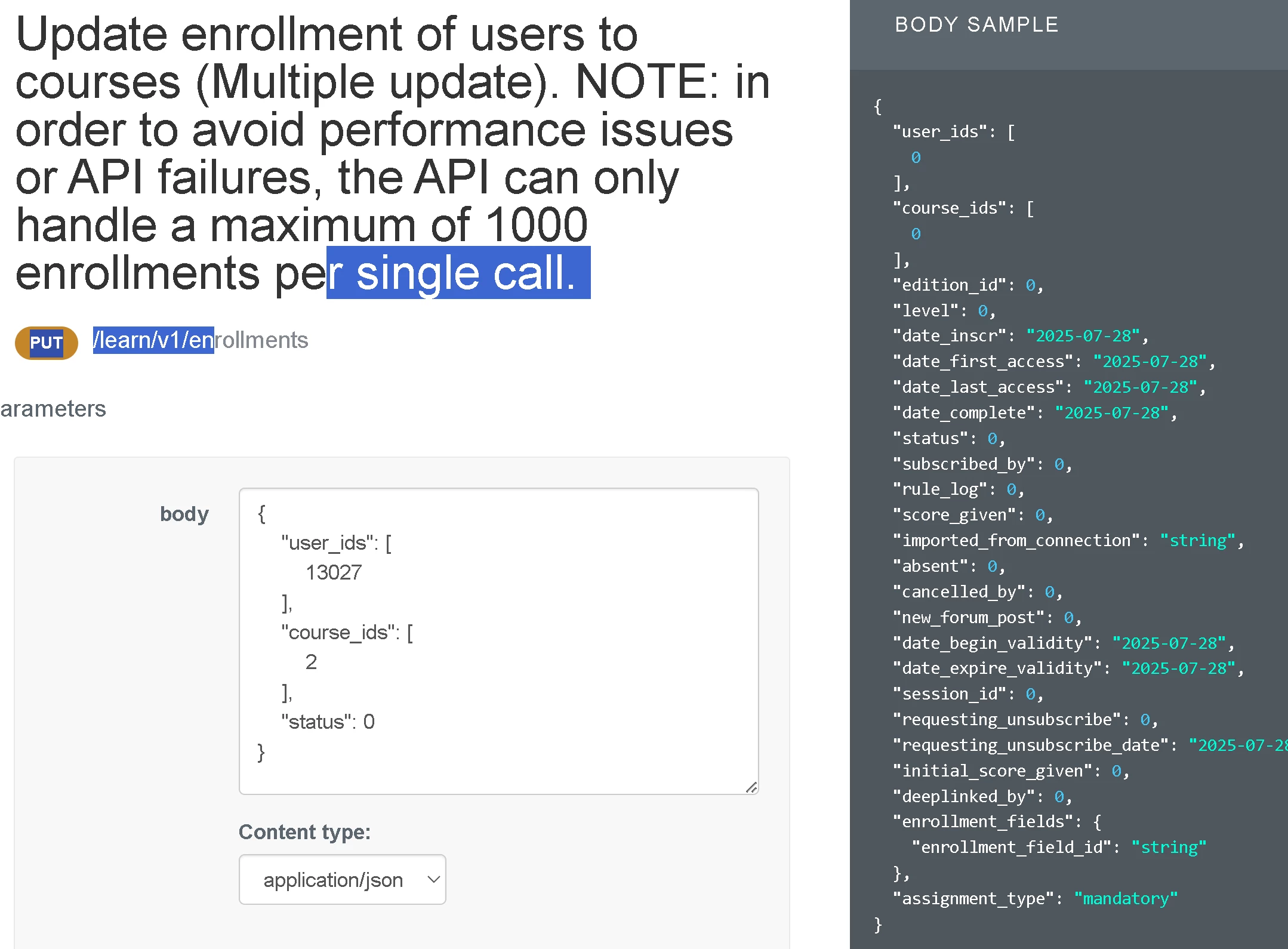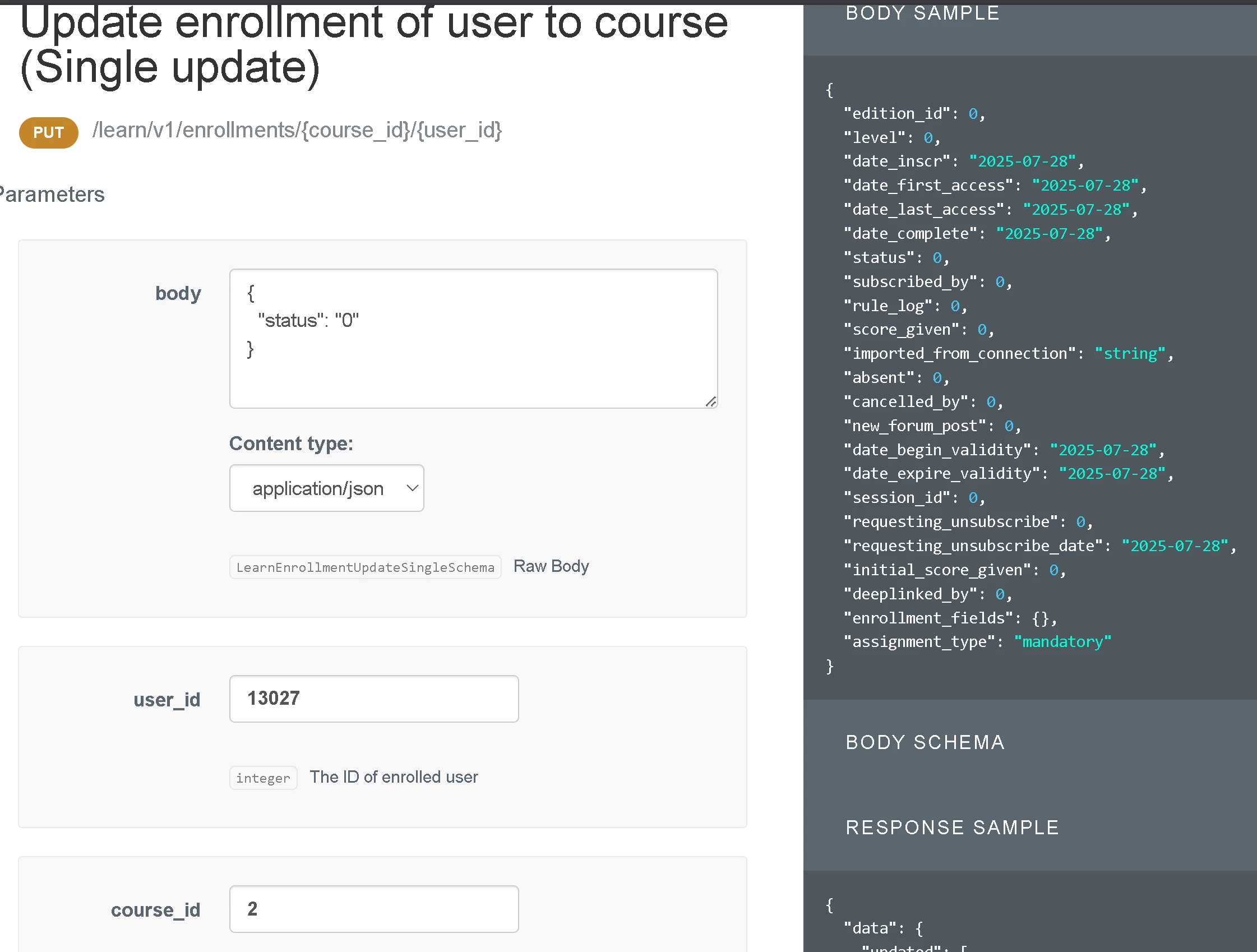 I’ve tried to use an API to change a users course enrollment status. It looks like it says it worked but when i check that users/course status it doesn’t change. Taking them from Completed to Enrolled. This screenshot shows what i have tried for this specific endpoint. The second screenshot shows the response.