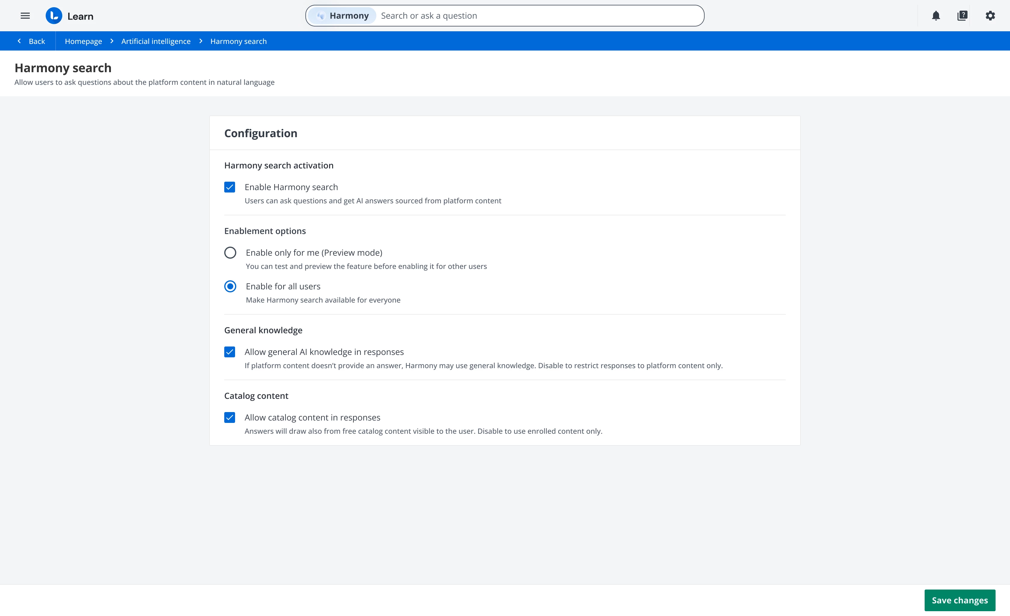 This means that Harmony Search will leverage catalog content as part of its answer generation, surfacing valuable training materials that were previously hard to find, and dramatically increasing the reach and usefulness of the system. You’ll be able to manage this directly from the configuration panel, deciding whether or not to include catalog content in the dataset used to generate answers.