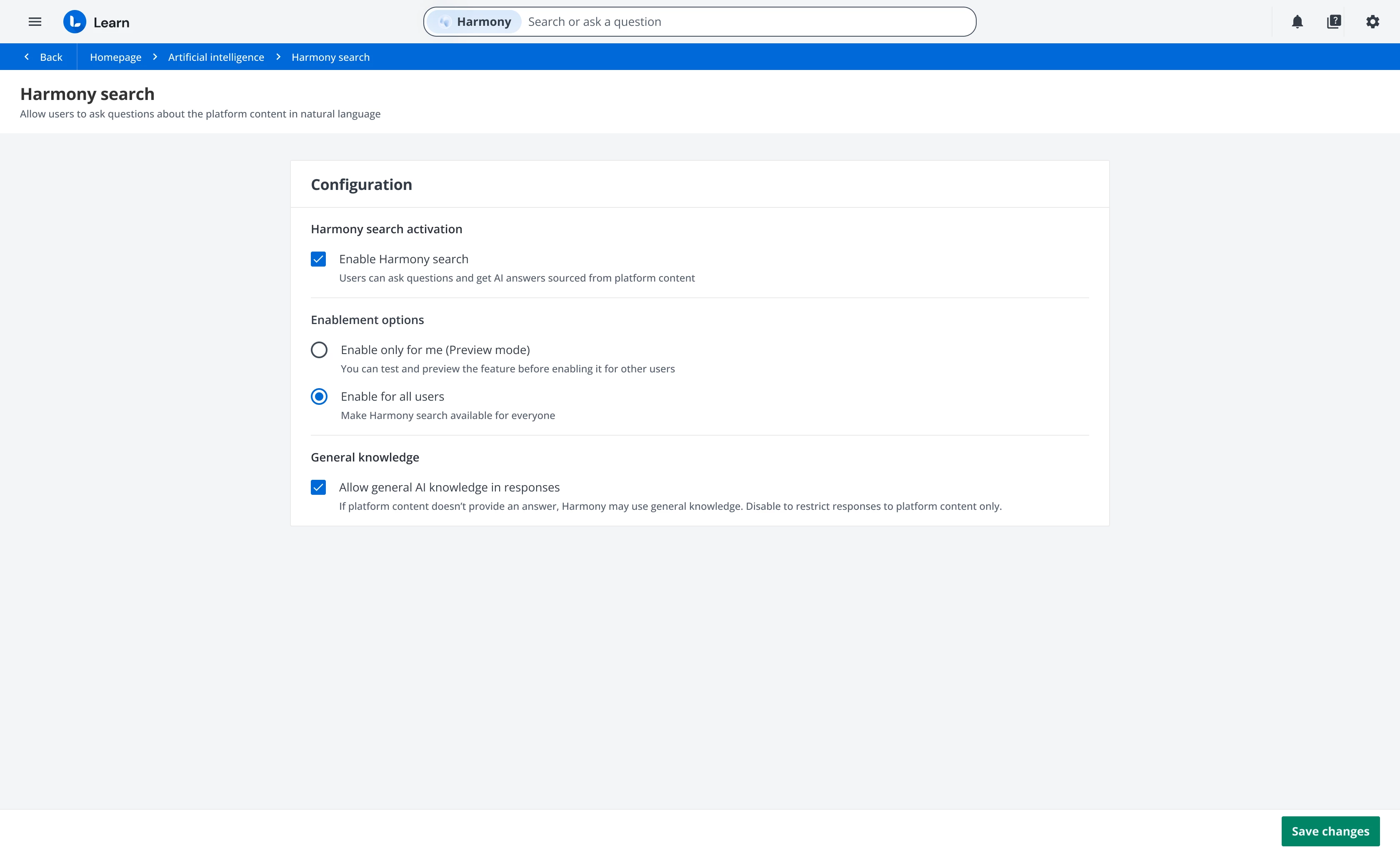 Currently, Harmony Search generates answers based only on content from courses in which the user has an active enrollment. Soon, we’ll introduce an option to expand the dataset used by Harmony Search to generate answers, by including content from free courses within the catalogs visible to the user asking the question.