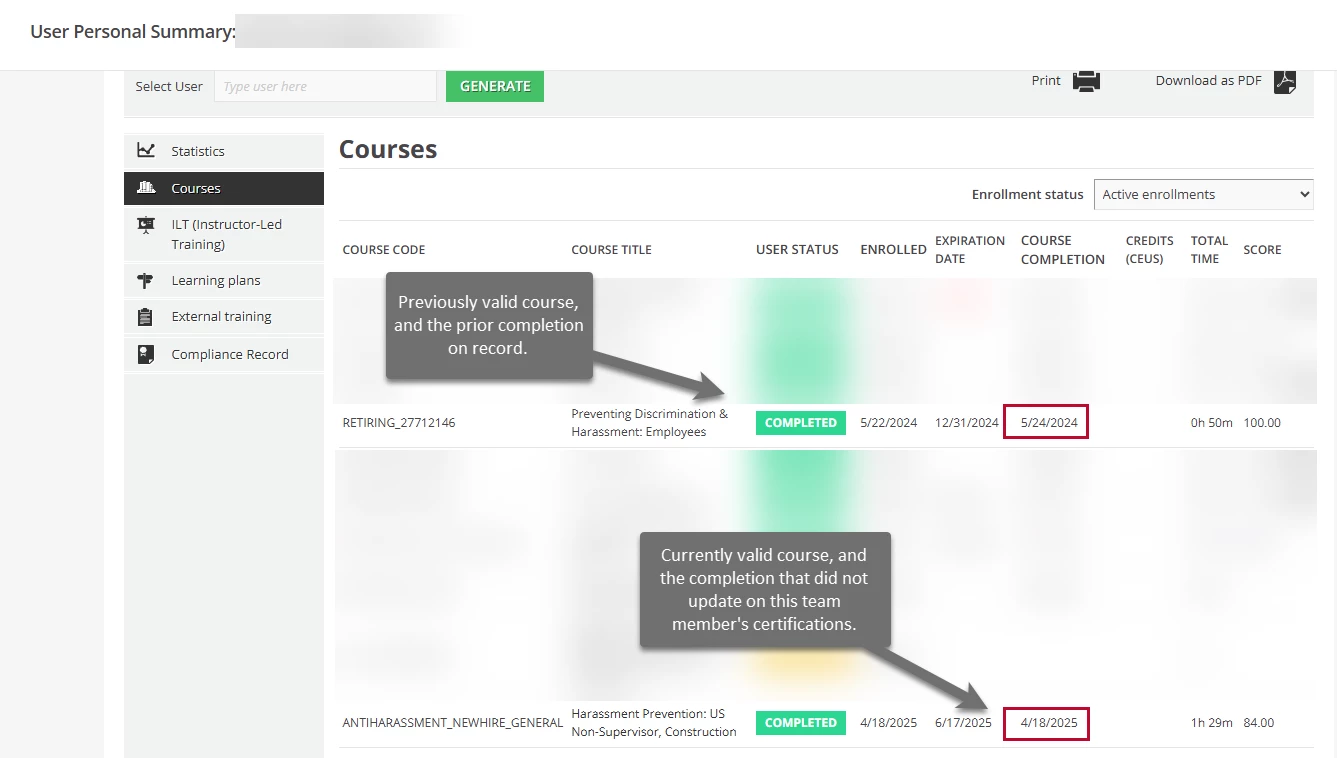 In these instances there was a “retired” training that is now under maintenance and cannot be accessed for record keeping, and the new training that is current and active. These users have all completed the new training, and all of them enrolled in and completed the training after the certification was set up. Even with the audit trail, I have no real way of knowing if they followed the “appropriate steps” to go through My Activities to seek out the course or if they searched it globally and enrolled in it that way, but since they wouldn’t have taken this course version before I’m honestly not sure if that would matter or not. One of the users who did not update was enrolled in the new version by me as an admin and her record did not update.