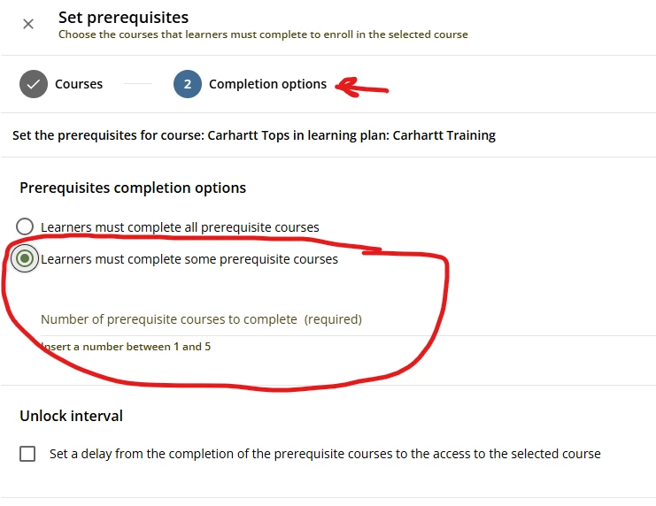 Then under Prerequisites, you can specify how many of them the learner needs to complete: