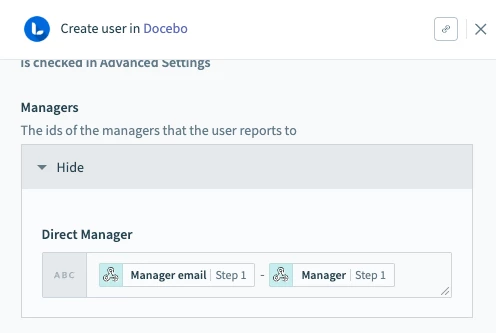 How can we create a Manager assignment in Docebo Connect (using Create user in Docebo) if our own system we’re pulling the values from doesn’t store the Manager IDs that Docebo seems to ask for - only Manager Name and email?