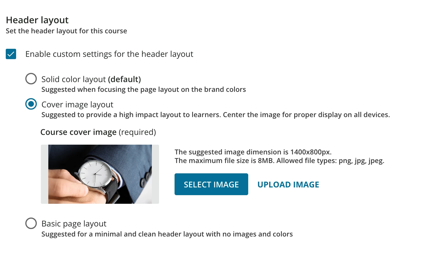 The 2 are separate options. Make sure you save the image selection for the header and click SAVE CHANGES on the course as well. You may need to refresh your screen to see the change.