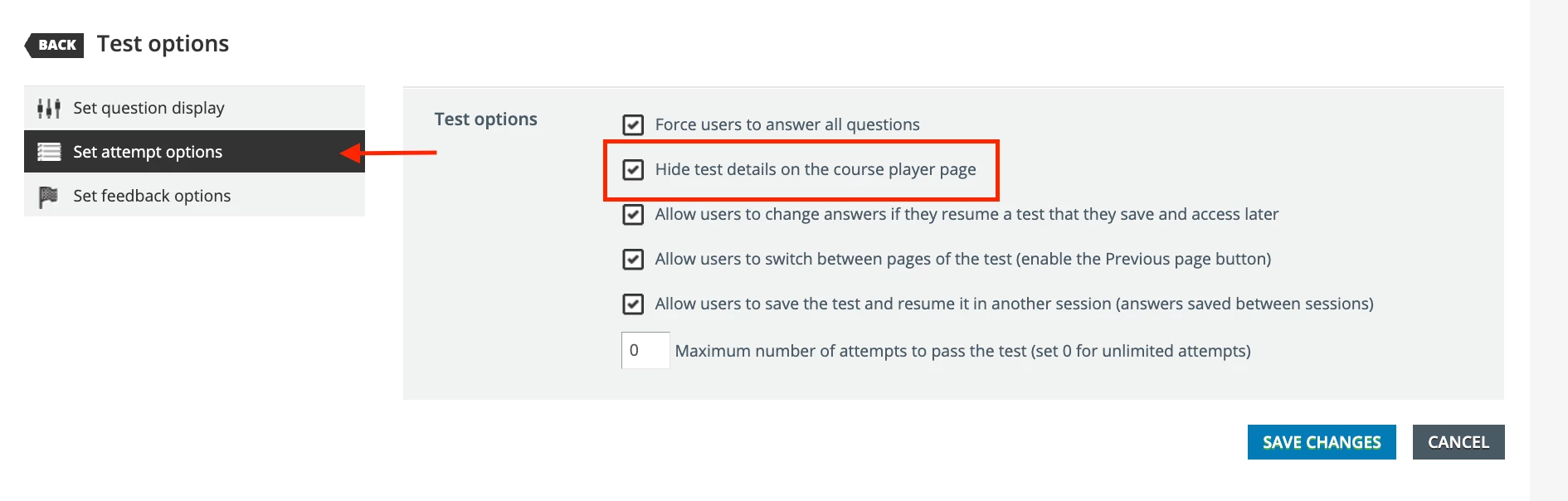 Has anyone figured out a way to hide the screen that appears before a learner takes a test (see below)?