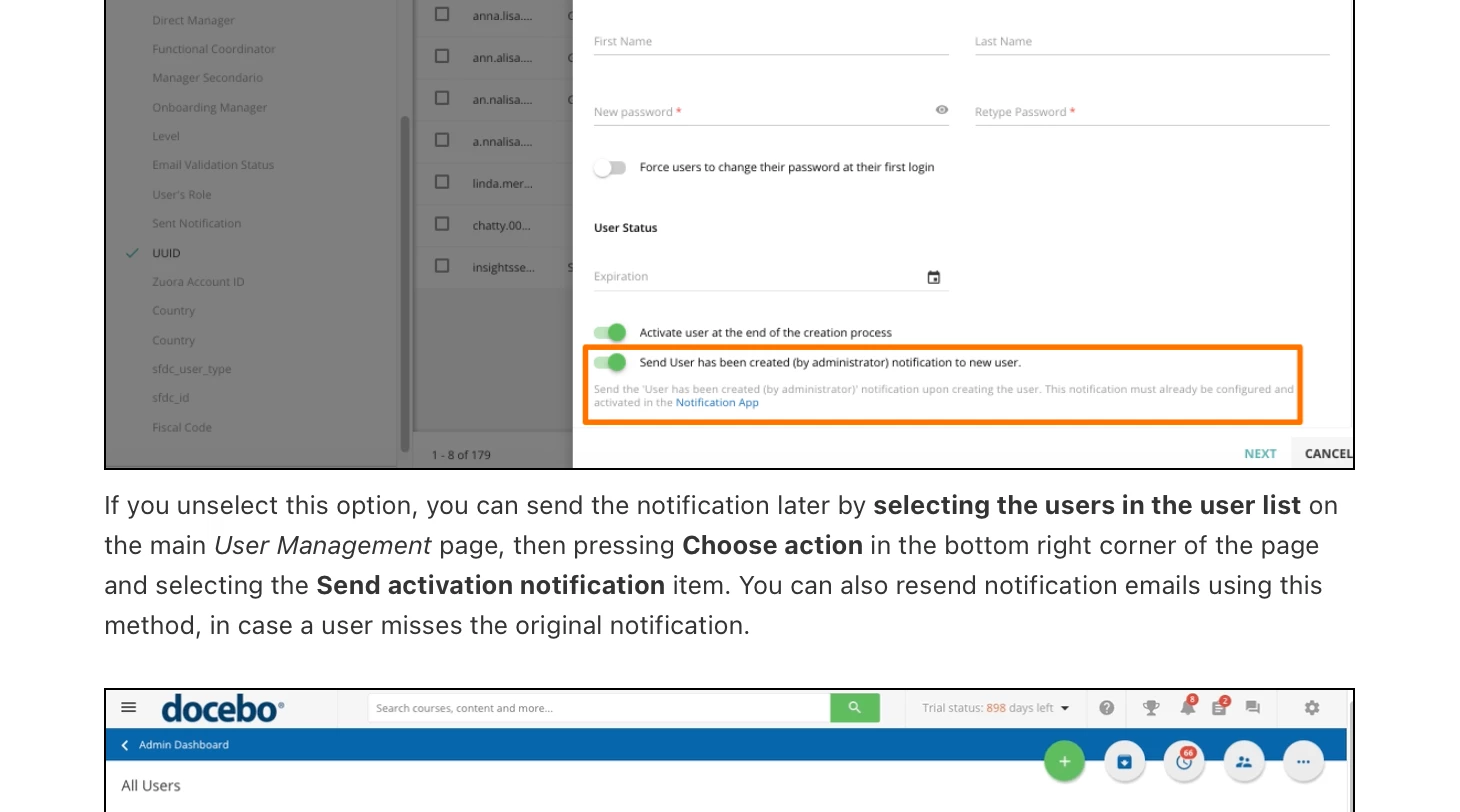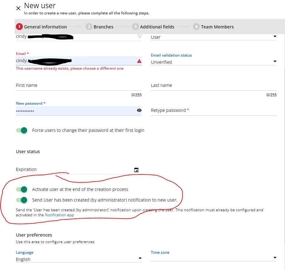 I have quite a few customers who were imported by csv who were given generic emails from their head office. However, a lot of them are not their real email addresses. What I am doing now is going in and editing their email address, then leaving Docebo to send a “Welcome” email with login instructions; aka “User has been created” from Outlook. The reason for this is because once the user has been created and the notification sent, the button to turn that on and off disappears. Is there a way to force another