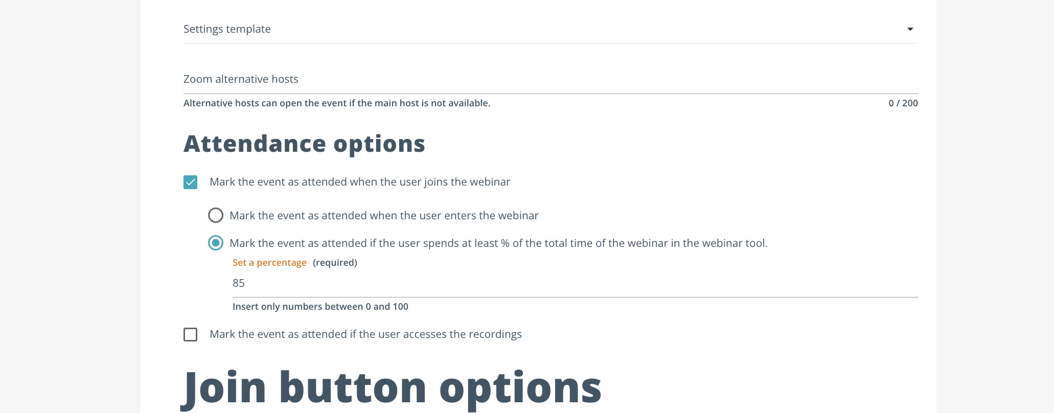 Event: Mark the event as attended if the user spends at least 85% of the total time of the webinar in the webinar tool.