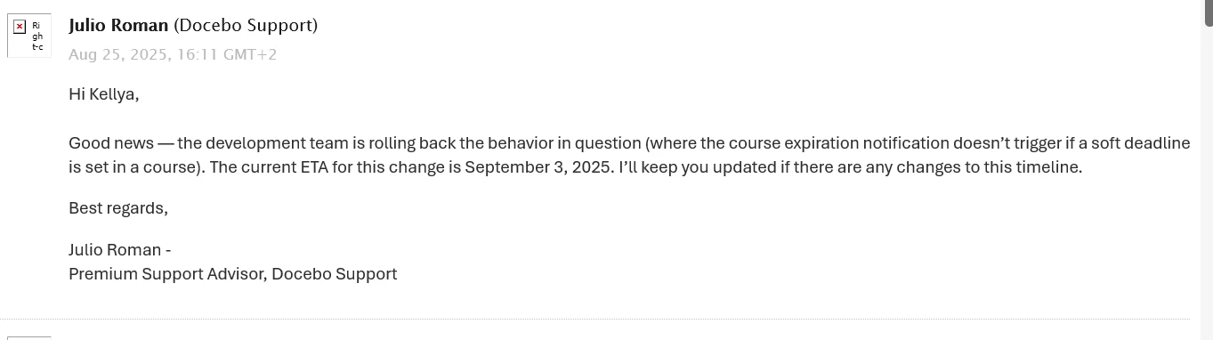 When I reached out to Docebo tech support, they shared the following: “This may seem unusual, but we corrected an error that was causing the Course Has Expired notification to trigger even when the Soft Deadline option was enabled. Please note that the expected behavior is that this notification will not be triggered when the Soft Deadline is active.”