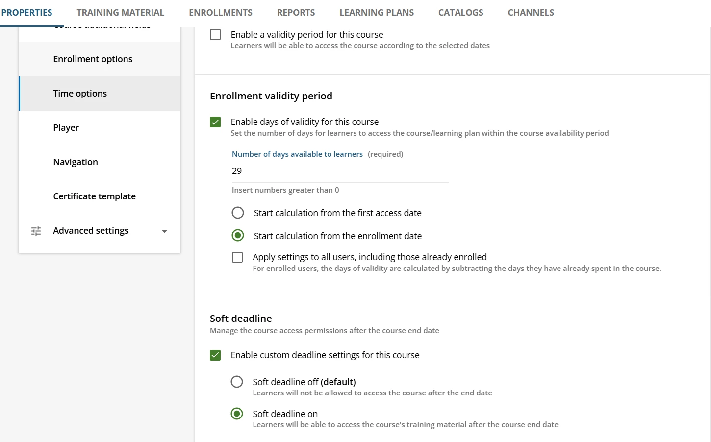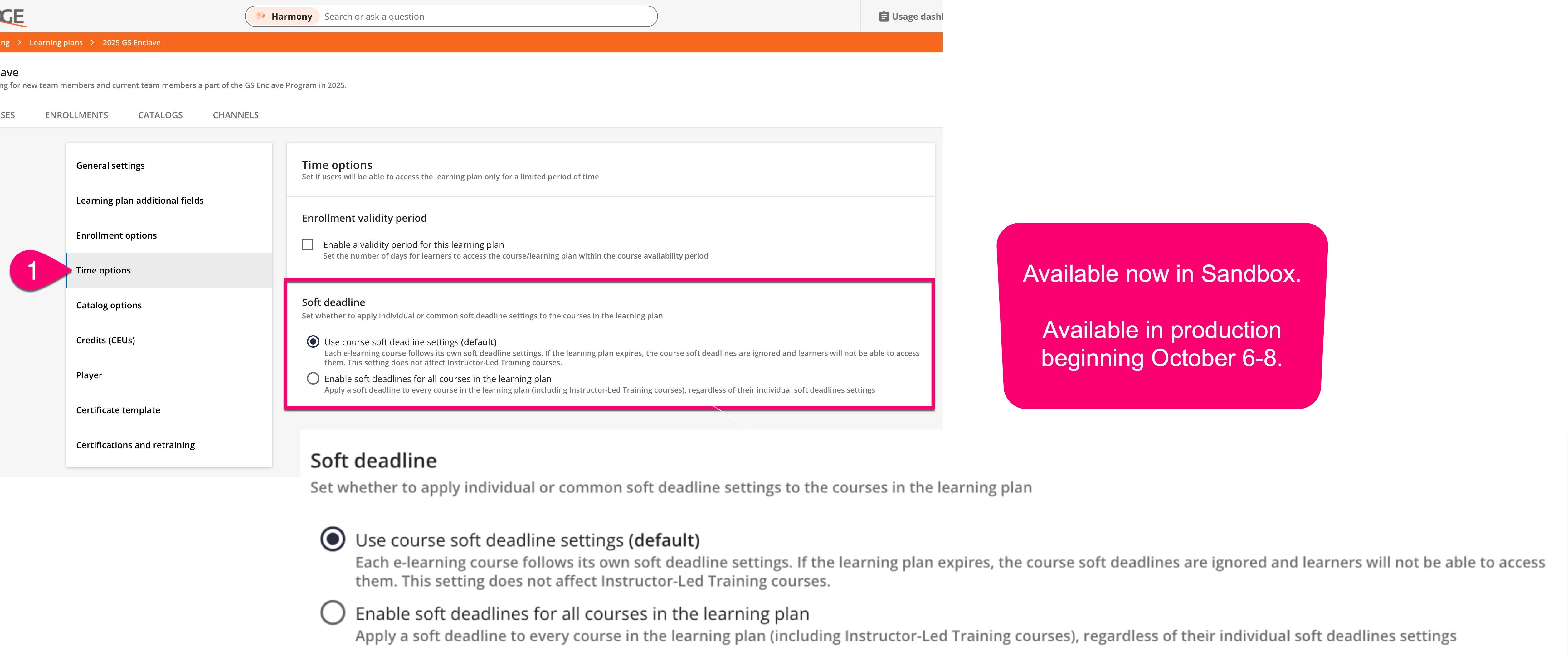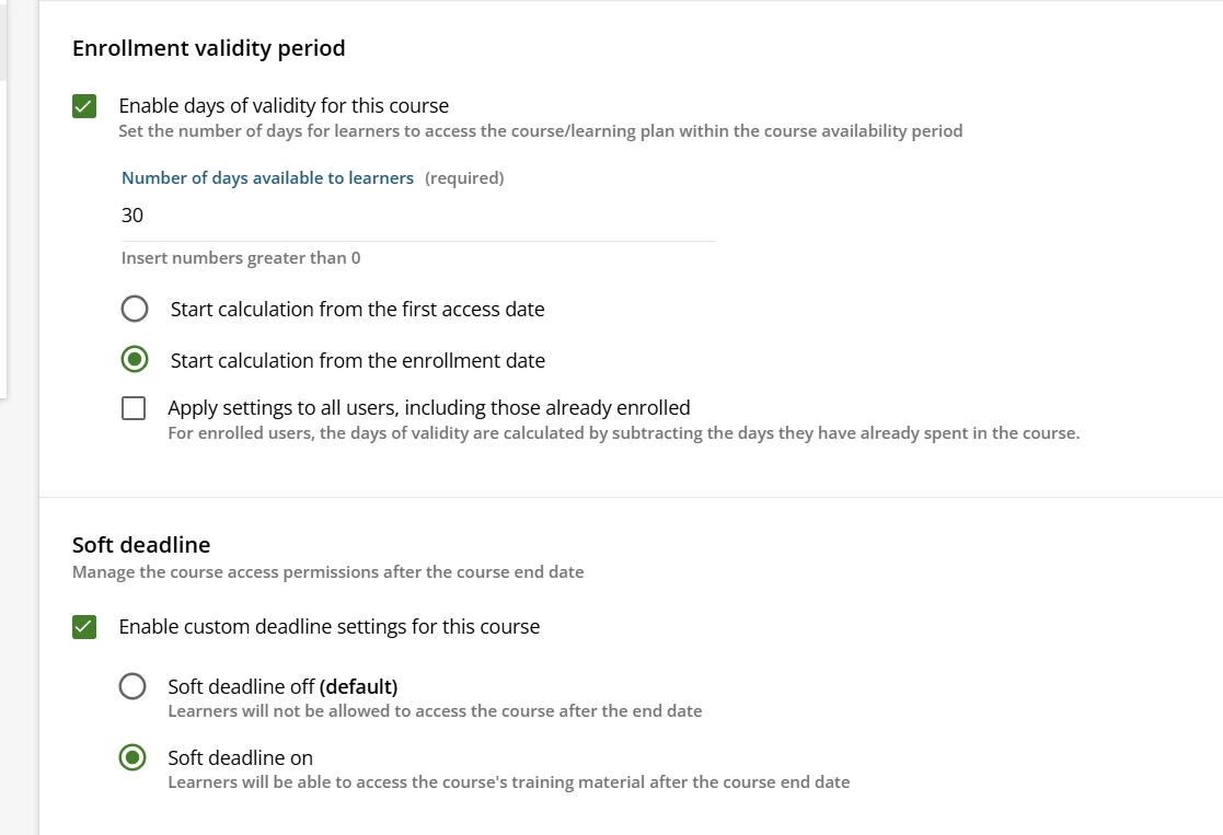 The new hire compliance courses are packaged in a learning plan. All courses have time option programmed at the course level of 30 days and the “soft deadline on” option, which is helpful for us so that if needed, the learner can access the course past the deadline and is not locked out.