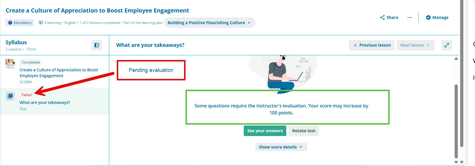 Currently, Docebo does not offer a built-in "Pending Evaluation" or ''waiting for evaluation'' status for tests awaiting instructor review. This limitation means that learners see a "Failed" status because their submission doesn't meet the minimum passing score due to pending evaluation.