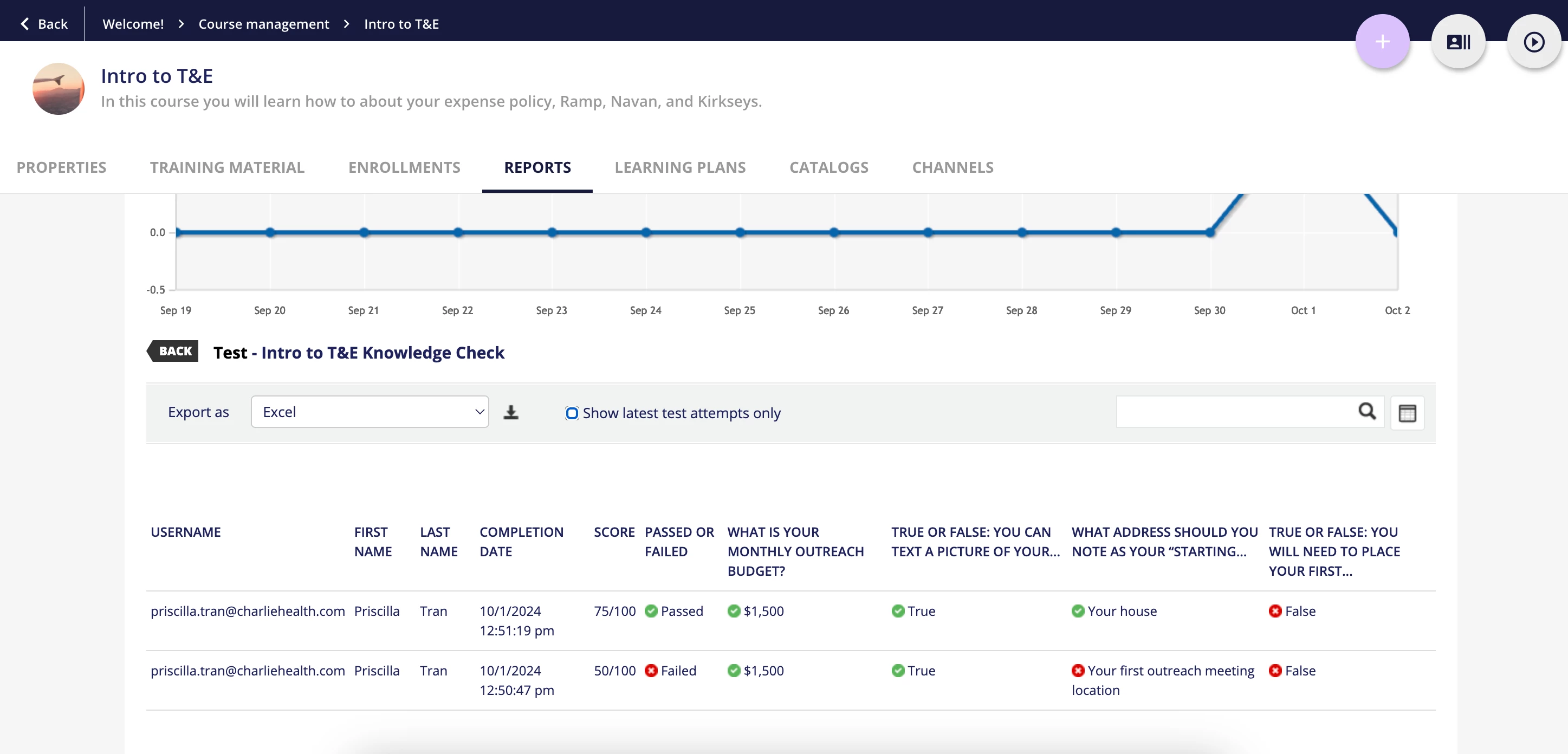 Goal: With this report I hope to be able to view the test scores (all attempts) of all users for each lesson.