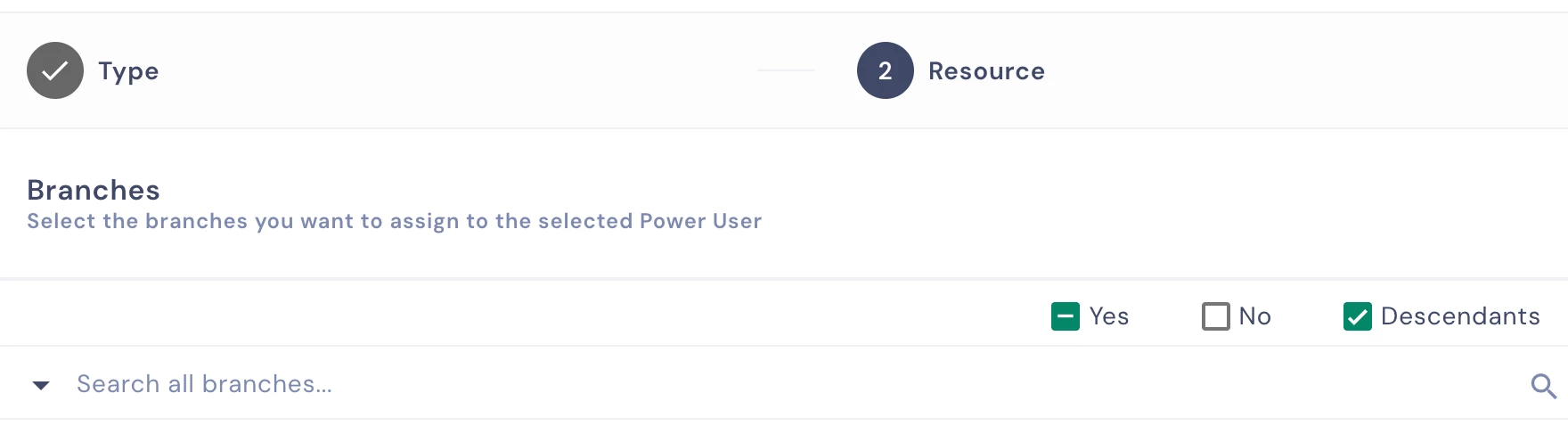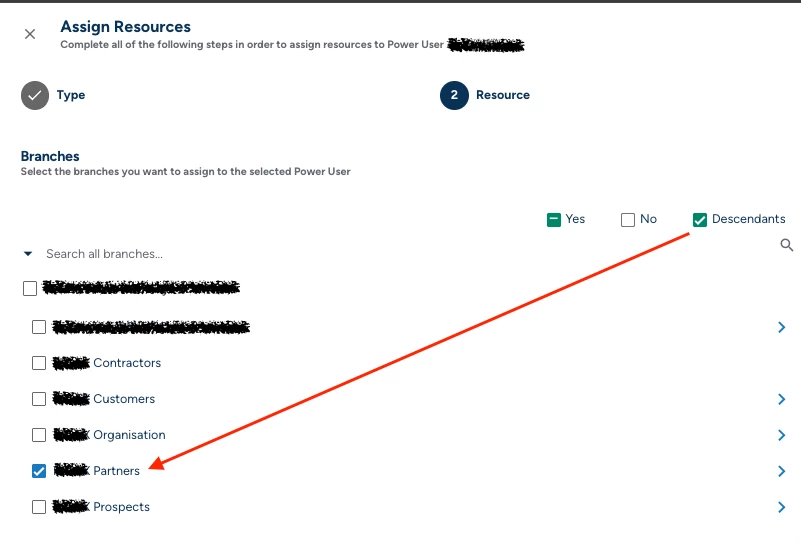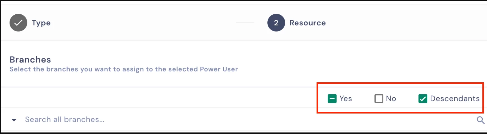 I’m trying to assign a resource (branch) to a support team member. When I assign it, the Descendants box is checked, but after I assign it, it’s marked as “No” in the table. I don’t see a way to enable branch descendants.