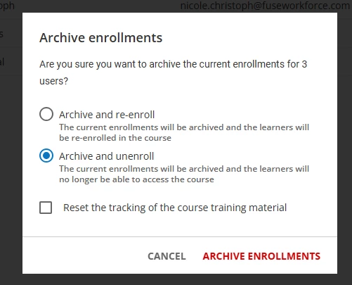 Important limitation: Archiving is a one-way action — while learners can be re-enrolled, the original enrolment date can't be restored, only the completion date.
