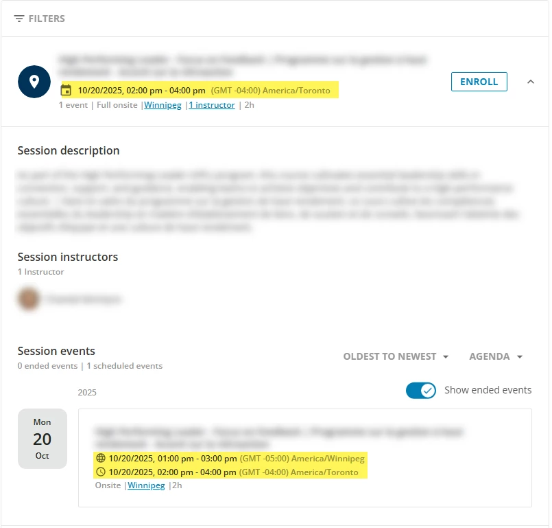 When creating sessions in different timezones, it seems that users see two timezones: local time and America/Toronto. Unfortunately, it displays America/Toronto first, and users need to click on the session/event to see the local time. For example, this session takes place in Winnipeg, MB, but the system is displaying America/Toronto. I have to click into the session to see the session time in America/Winnipeg, which is 1:00 PM - 3:00 PM.