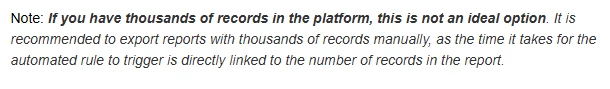 Note: If you have thousands of records in the platform, this is not an ideal option. It is recommended to export reports with thousands of records manually, as the time it takes for the automated rule to trigger is directly linked to the number of records in the report.