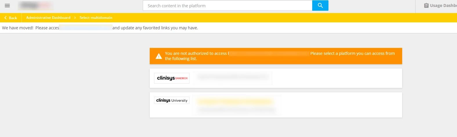 - In the localization tool, we updated the “You are not authorized” message to say “We have Moved! Please take a moment to update your favorited links. Click the button below to proceed”. (This message was updated from the localization tool, under the multidomain module of the localization tool.)