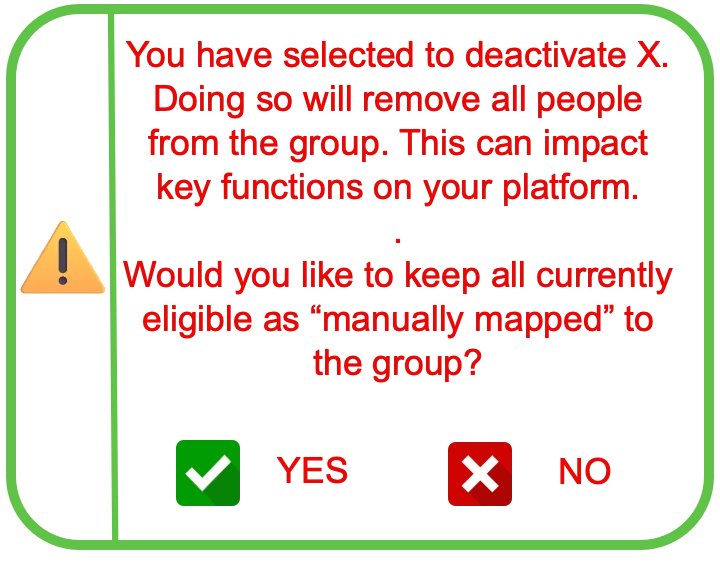 I am going to suggest an option to “keep people in the automatic group” as a dialog that appears before deactivating a group (please don’t make us have to “switch users to a manual assignment” as another step….I know the function is there and it is helpful). Something like this dialog: